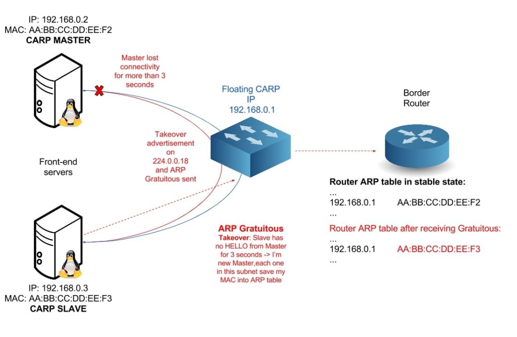 اگر به هر دلیلی دستگاه مستر از کار بیفتد یا ارتباطش قطع شود، دیگر اعضای گروه این موضوع را تشخیص می‌دهند و طبق یک الگوریتم از پیش تعیین شده، یکی از دستگاه‌های بکاپ به عنوان مستر جدید انتخاب می‌شود. این فرآیند انتقال نقش به سرعت و بدون قطعی قابل توجه در سرویس‌دهی انجام می‌شود. CARP از یک الگوریتم هش برای تعیین اولویت دستگاه‌ها در گروه استفاده می‌کند. این الگوریتم بر اساس فاکتورهایی مانند آدرس IP فیزیکی دستگاه، شماره گروه CARP و یک کلمه عبور مشترک، اولویت هر دستگاه را محاسبه می‌کند. دستگاهی که بالاترین اولویت را داشته باشد، به عنوان مستر انتخاب می‌شود.